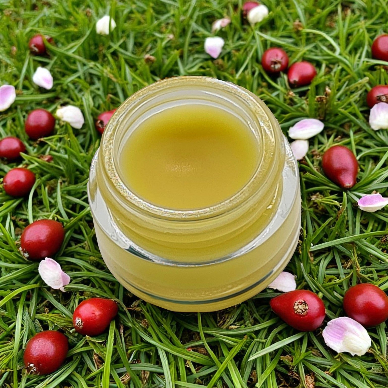 A small open container of 'Natural Gypsy' Rosehip Lip Balm placed on a surface with scattered rose hips and dry leaves.